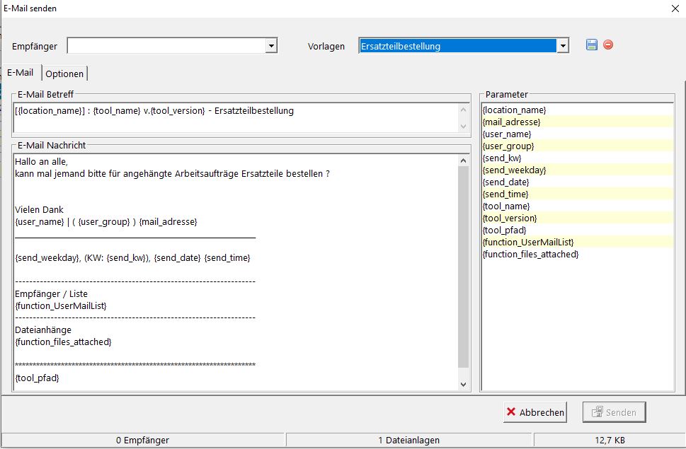 E-Mail Text und Betreff können mit Parametern erstellt und in Vorlagen gespeichert werden.